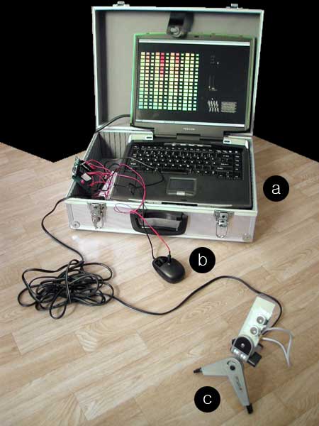 The projection is driven by Flash and a laptop(A), that has ultrasonic sensors (C)