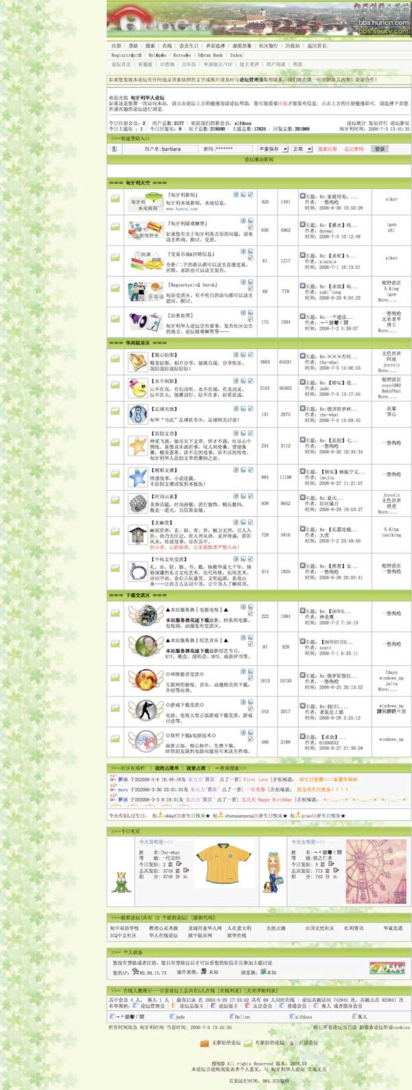 The BBS has a lot of occasional users. Fifty to sixty people represent the "hard core", some of whom met through the forum, and are now friends in real life. This BBS is also important for those Chinese in the homeland who consider trying their luck in Hungary . Its look is completely different from that of other Hungarian or European forums, which have a well -arranged structure, and concentrate on the text; the Chinese BBS is jam-packed with animated graphics and colourful icons. Everyone has their own avatar, or personalised icon, and illustrated signature, which often takes up more of the entries than the actual comment.